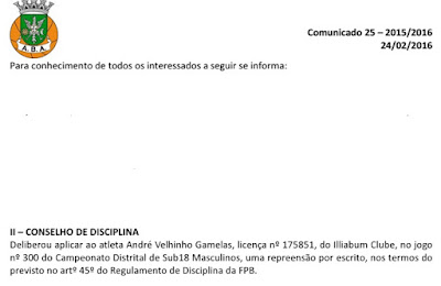 Saiu a 24 de Fevereiro o "castigo" a um atleta do escalão de sub-18 da ABAveiro,  perante um comportamento incorreto que teve num jogo do campeonato distrital...jogo realizado a 6 de Dezembro de 2015!!!